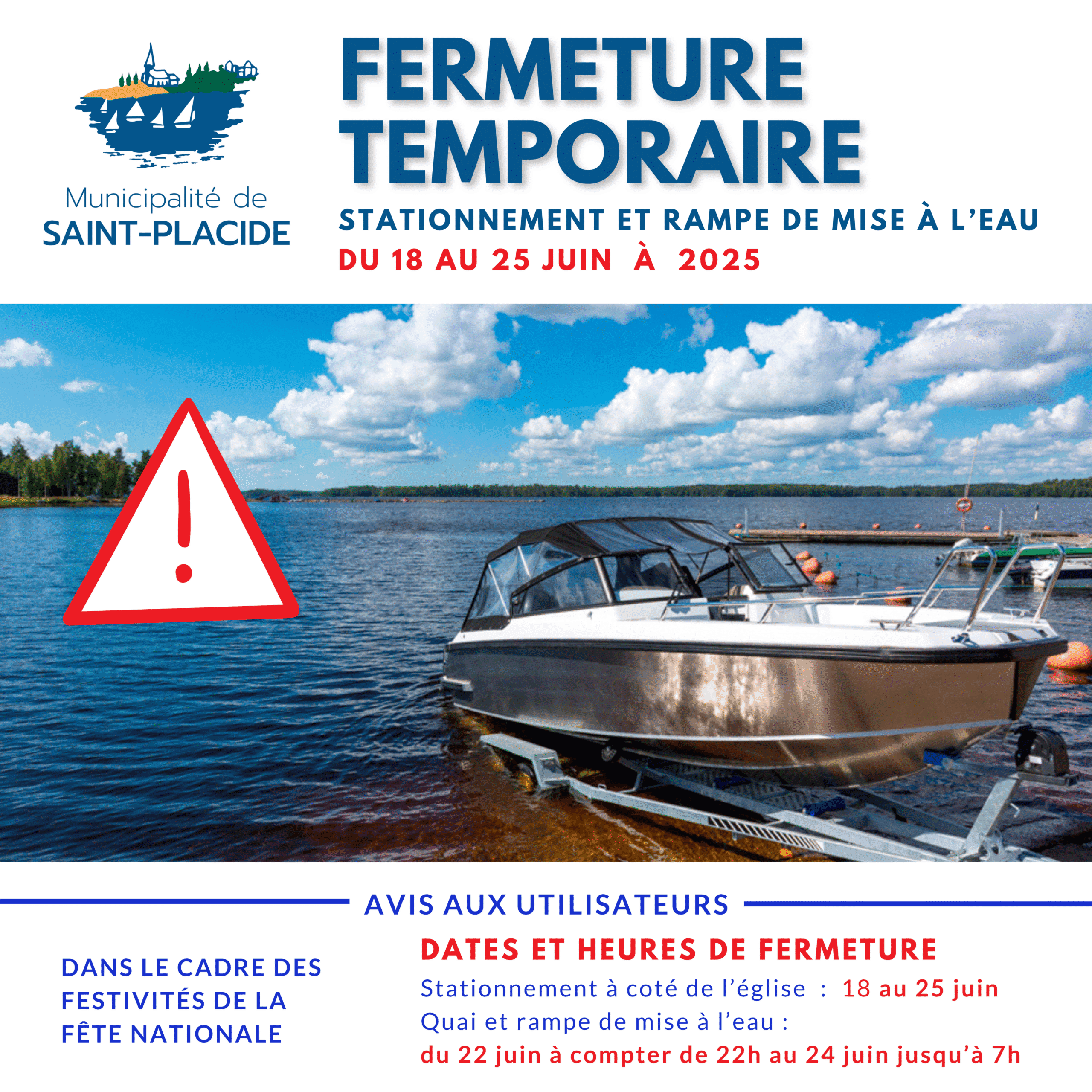 Veuillez noter qu’à l’occasion des festivités de la Saint-Jean, le stationnement, le quai et la rampe de mise à l’eau seront fermés temporairement afin d’assurer le bon déroulement des activités et la sécurité de tous.