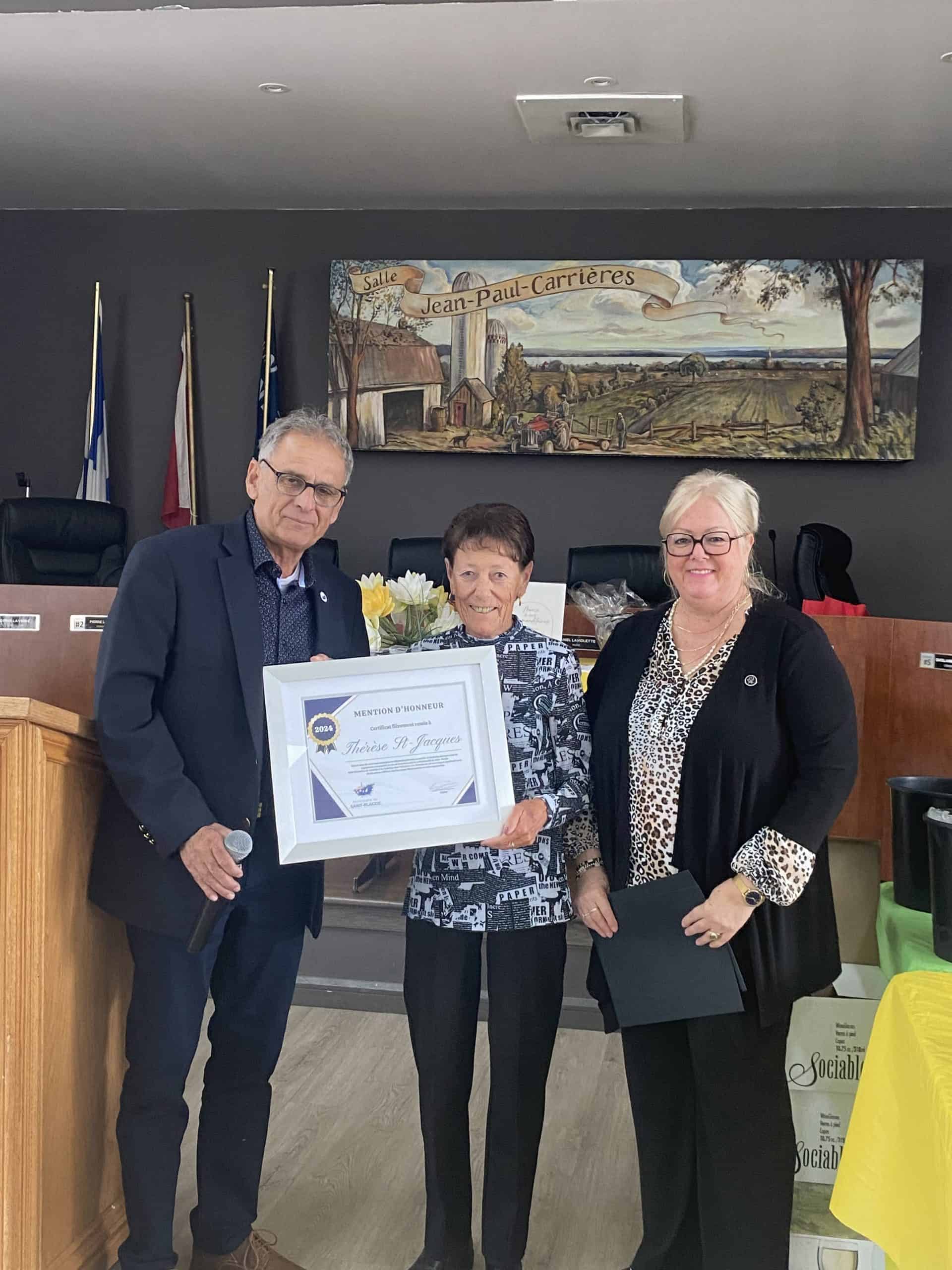 Ce sont plus de 80 cœurs battants qui ont œuvré à faire vibrer et rayonner notre communauté en 2023. Cet engagement désintéressé et cette générosité ont un impact immense sur nos vies et notre société. Chaque effort, chaque heure consacrée et chaque sourire offert apportent une lumière d’espoir et de solidarité. Dans le cadre d’un brunch fort coloré, avec la présence de Madame Sylvie D’Amour, députée de Mirabel, le Conseil Municipale a tenu à remettre une mention d’honneur pour souligner les apports exceptionnels de Madame Thérèse St-Jacques et de Monsieur Paul-Émile Viau.