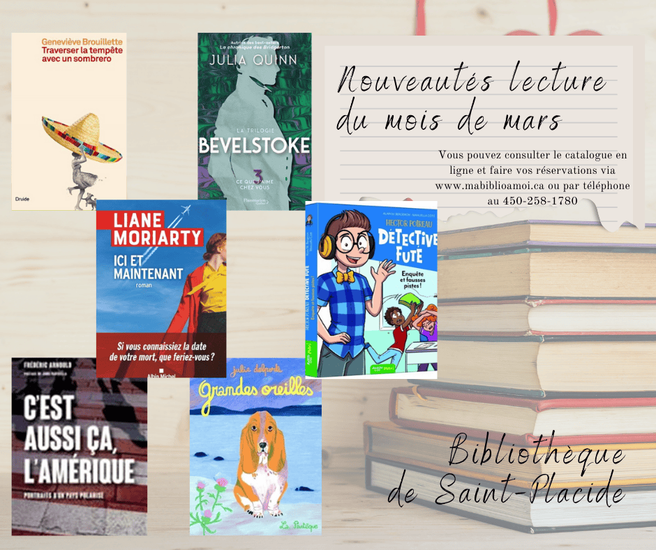 Le mois de mars s’annonce avec son renouveau à la bibliothèque de Saint-Placide ! Venez découvrir nos toutes dernières nouveautés littéraires, fraîchement arrivées pour accueillir le printemps. Romans captivants, essais inspirants, bandes dessinées, livres jeunesse… il y en a pour tous les goûts !