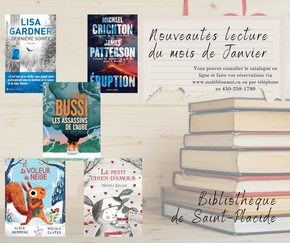 La nouvelle année commence en beauté à la bibliothèque de Saint-Placide ! Venez découvrir les dernières nouveautés littéraires fraîchement arrivées sur nos rayons. Romans captivants, essais inspirants, bandes dessinées, livres jeunesse… il y en a pour tous les goûts !