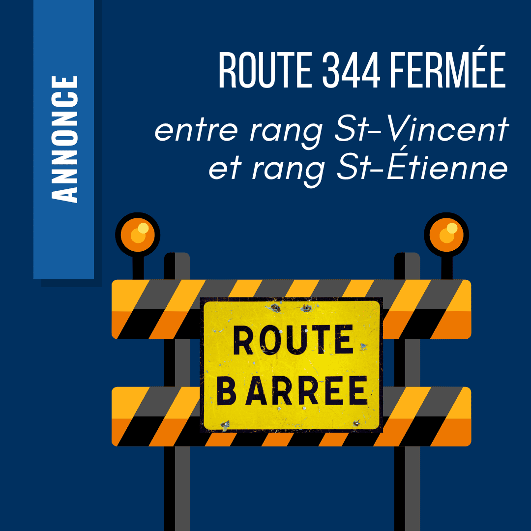 Veuillez prendre note que la route 344 est actuellement fermée à la circulation entre le rang St-Vincent et le rang St-Étienne, et ce pour une durée indéterminée, en raison d’un incident. Nous vous invitons à composer le 511 pour obtenir toute information ou assistance du ministère des Transports.