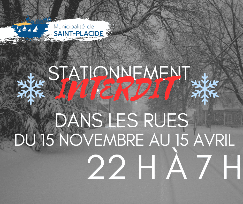 Pour assurer la sécurité des déplacements et faciliter le déneigement durant la période hivernale, il est interdit de stationner dans les rues de la municipalité du 15 novembre au 15 avril, entre 22 h et 7 h.